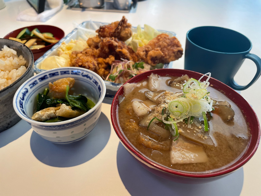 唐揚げ定食です。副菜、お漬物、メインのから揚げ、同じく茶めしと豚汁のセットです。