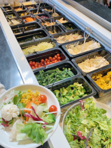 セットでサラダバーが付いてくるのでフレッシュなサラダはもちろん、デザートには果物、ゼリー、わらび餅、マシュマロ、プリン、シュークリーム等も食べ放題。