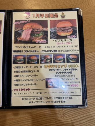 日替わりランチは1,000円以下で食べられるのでとってもお得。お財布事情的に惹かれたが、「平日人気No.1」の文字を見つけ、せっかく来たのだからと「ランチ志士くんバーガー」を注文。ドリンクはアイスコーヒーを選んだ。(外は寒かったが、ハンバーガーにはアイスコーヒーでしょう!)