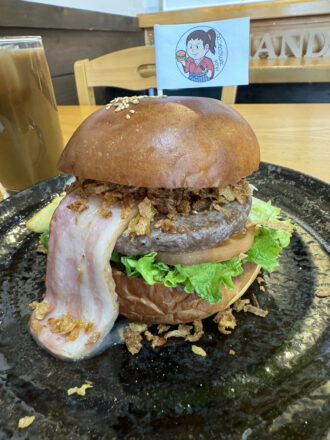 バンズの上下それぞれに別のソースが塗られていて、違う風味が楽しい!それからパティが肉肉しいのにすごく柔らかい。牛100%なんだとか。オニオンフライの食感と香ばしさもいいアクセントになっていて、ベーコンもジューシーでとってもおいしい!