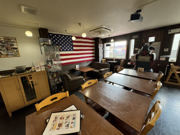 入口の真正面には甲冑が鎮座し、少々びっくり。壁にはでっかい星条旗が掛けられ、写真には写っていないが海外のナンバープレートやカラフルなステッカーなどで一面飾られている。にぎやかだけど、どこか落ち着く不思議な雰囲気。4人で座れるソファ席や小さいテーブル席もあり、家族や友人はもちろん、一人でも気軽に利用できそうだ。