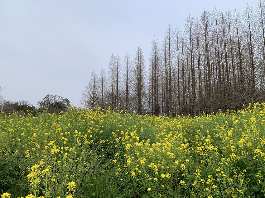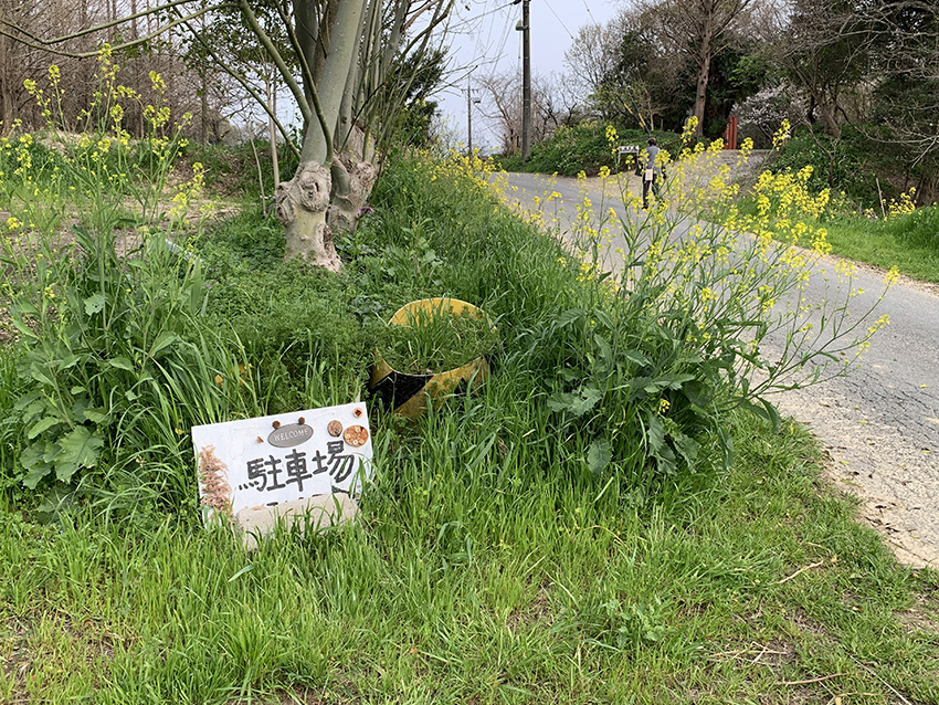 私有地とのことですが、ありがたいことに駐車場が3台分ほど用意されていました。手作りの可愛らしい「駐車場」の看板を見つけて車を停めると、なんとすぐ隣には満開の黄色い菜の花畑が広がっていました!おぉ~!いきなり春爛漫な風景にテンションが上がります!