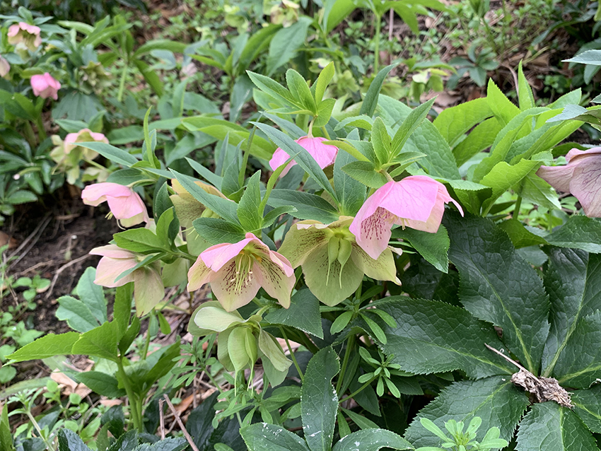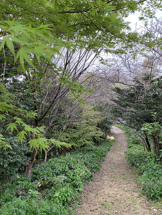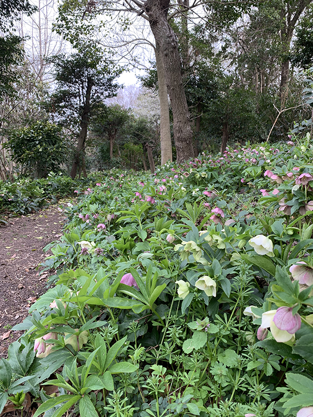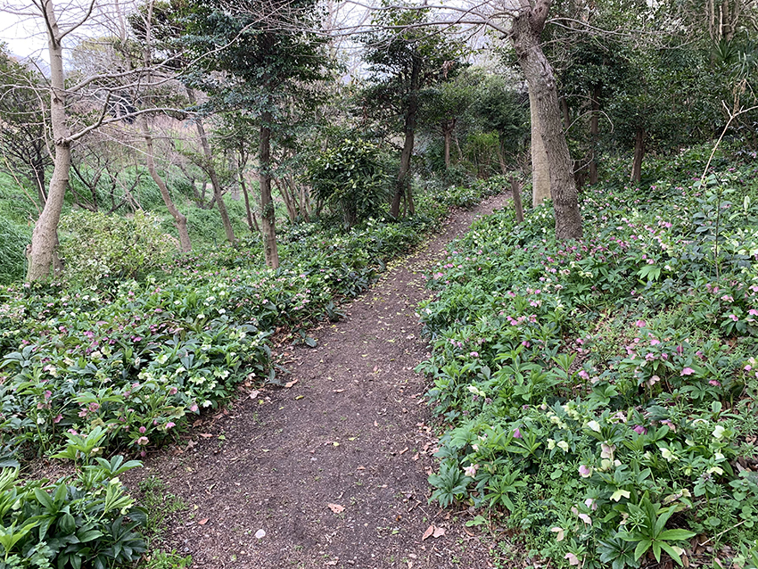 さっそく森の中に足を踏み入れると、花の楽しめる小道が何本も続いていました。そして足元には、見渡す限りのクリスマスローズが!見事な群生です。