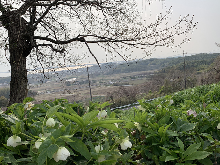 森の入り口や小道沿いには「クリスマスローズの森」という看板がいくつも立てられており、現在はこちらのオーナーさんやボランティアの方々が大切に整備しているそうです。 そして、なんと言っても素晴らしいのがその景色。高台にあるため、遠くに伊勢湾に浮かぶセントレア(中部国際空港)が一望できるんです!訪れた日はあいにくの薄曇りで写真は少しぼんやりしていますが、心地よい春風を感じながらの絶景でした。