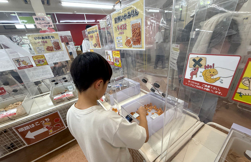 約40種類以上のえびせんべいが無料で試食できる「試食&販売コーナー」