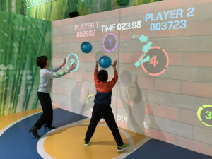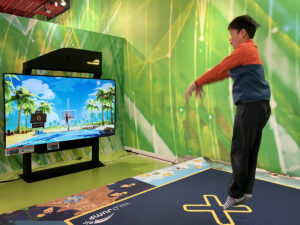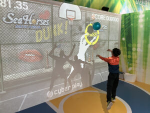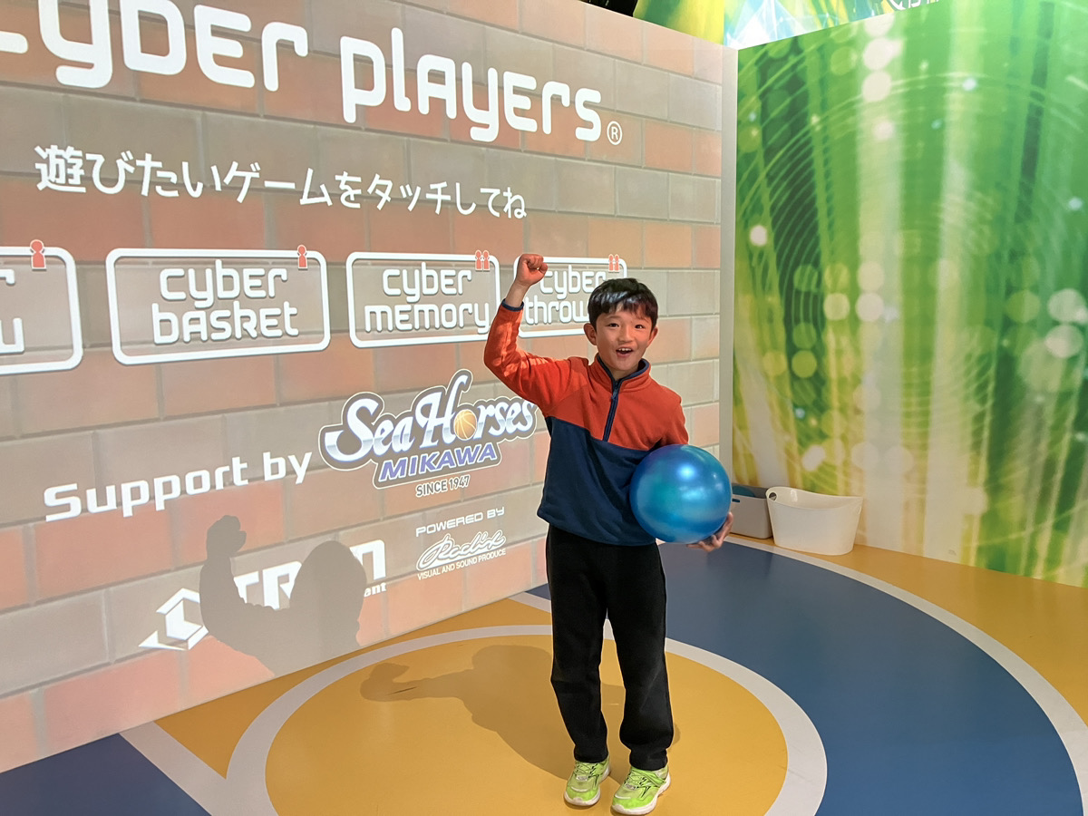 お目当ての体験型アクティビティ「ユーズVスポーツ」のコーナーに行くと、親子で楽しむ姿や友達同士ではしゃぎまくるキッズの姿が……!取材時は春休みだったこともあり盛り上がっていました!アクティビティは4種類あり、一番人気は地元のプロバスケットボールチーム「シーホース三河」とコラボした「サイバープレイヤーズ」。映像が映った壁にボールを投げてプレイするバスケットボールゲーム。2人プレイもできるので親子対決して盛り上がろう!