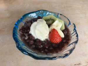 我が家では毎日汗だくで学校から帰ってくる息子達のリクエストで、冷やしぜんざいに挑戦!アレンジレシピと言っても、冷やしたぜんざいを袋から器に移して、アイスクリームと好みのフルーツを飾るだけ!餡が程よい甘さでフルーツの酸味と相性バツグン。あっと言う間に完食していました。