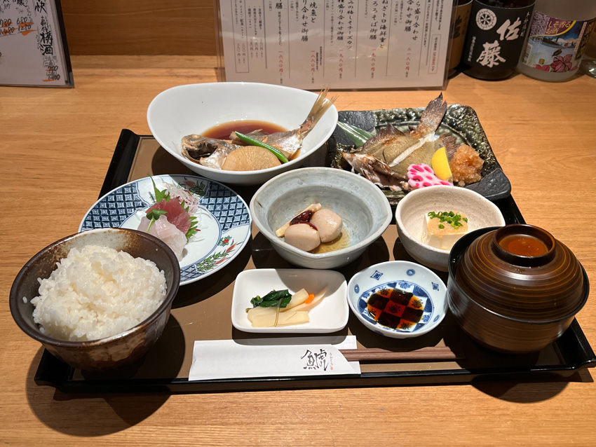今回いただいたのは、「本日の地魚煮付けと焼魚とお造り三種盛り合わせ御膳」。 この御膳は、その日のお勧めの魚を煮付けや焼魚、お造りで楽しめる贅沢なランチセットです。