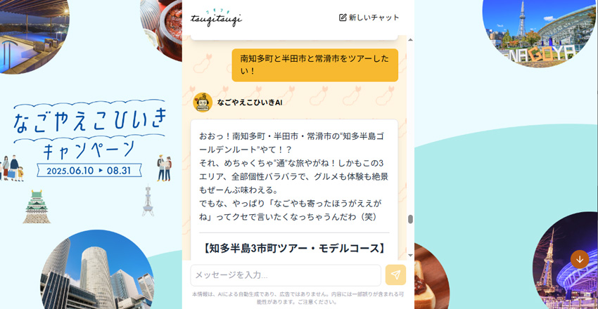 さらに、どこ行こうか迷ったら会話型AIコンシェルジュ「なごやえこひいきAI(https://nagoya-ai.tsugitsugi.com/)」が旅のプランをサポートしてくれます!知らなかった名所やグルメも見つかるかも!