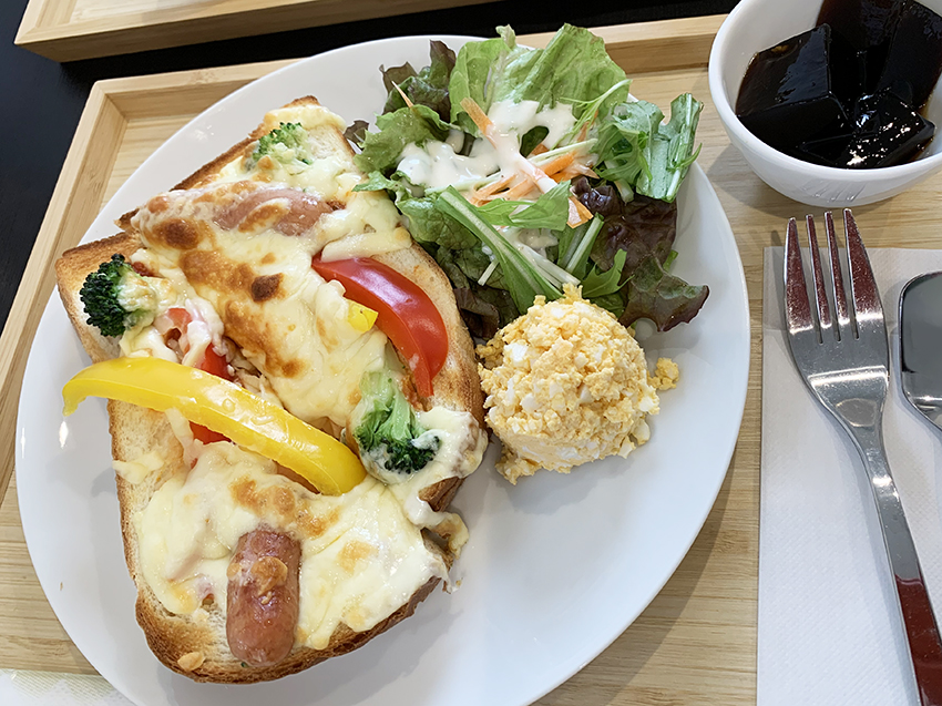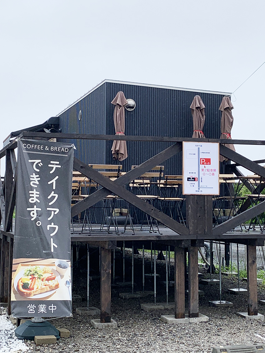 「テイクアウトできます」の垂れ幕に美味しそうなトーストの写真が。これは気になります!
