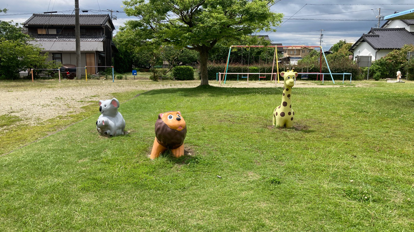 遊具:ブランコ、鉄棒、ローラー滑り台付き築山、トンネル、いす(ライオン・キリン・サイ)、砂場