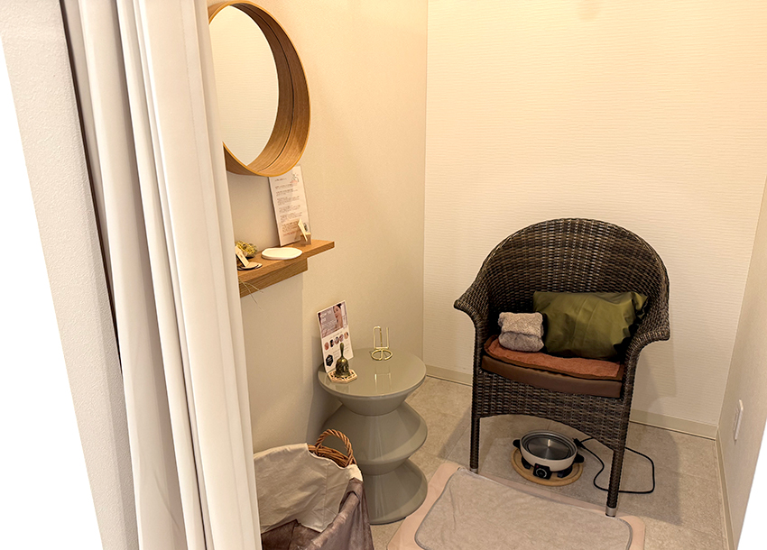 さらに、一般的なよもぎ蒸しサロンでは“黄土椅子”と呼ばれる背もたれのないタイプの椅子が使用されますが、麗温さんではよりリラックスして過ごせるように 背もたれのついたラタンチェアが採用されています。※2