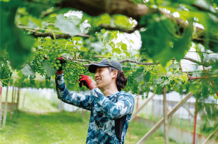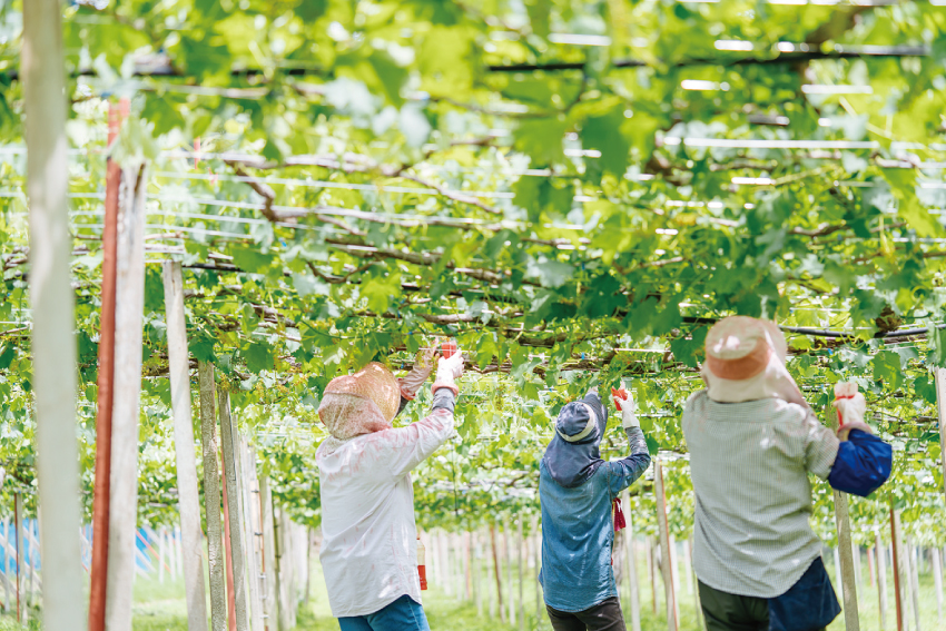 こちらの農園は、デラウェアや巨峰の栽培がまだ珍しかった時代から続く、四代続くブドウ農園です。今の時期は、房作りや種なしにするための処理、そして味を左右する大切な「摘粒(てきりゅう)」という作業中。今回、その作業の様子を見せてもらいました。
