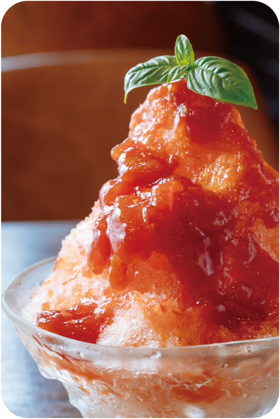 まるでフルーツソースをかけたような、真っ赤なトマトのかき氷。ひと口食べれば、果肉感たっぷりのまろやかな甘さと、すっきりとした酸味がふわりと広がります。「完熟トマトだけを使い、トマト本来のフルーティーな甘みと爽やかさを引き出しました。他ではなかなか味わえない、夏だけの特別なかき氷です」と話してくれたのは、オーナーの川口さん。夏だけの特別な味、体験ください!