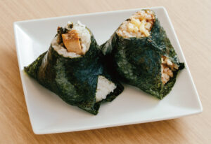 左:自家製チャーシュー、右:チーズおかか。鬼崎産海苔を使ったおむすびは、おみそしる+おつけものをセットにできます