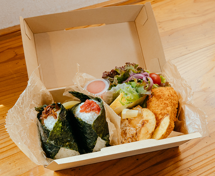 おにぎり茶屋の2号店は、テラス席やドッグランも併設された、家族連れやペット連れに嬉しいスポット。にぎりたてのおむすびを彩り豊かなおかずと一緒に詰めたBOXは、見た目も満足感も◎。お好きなおにぎり2つに、から揚げ、コロッケ、ポテトなどのおかずがぎっしり。プチデザートも付いて、ランチにも夕食にもぴったり。イートインでも、テイクアウトでも楽しめます。