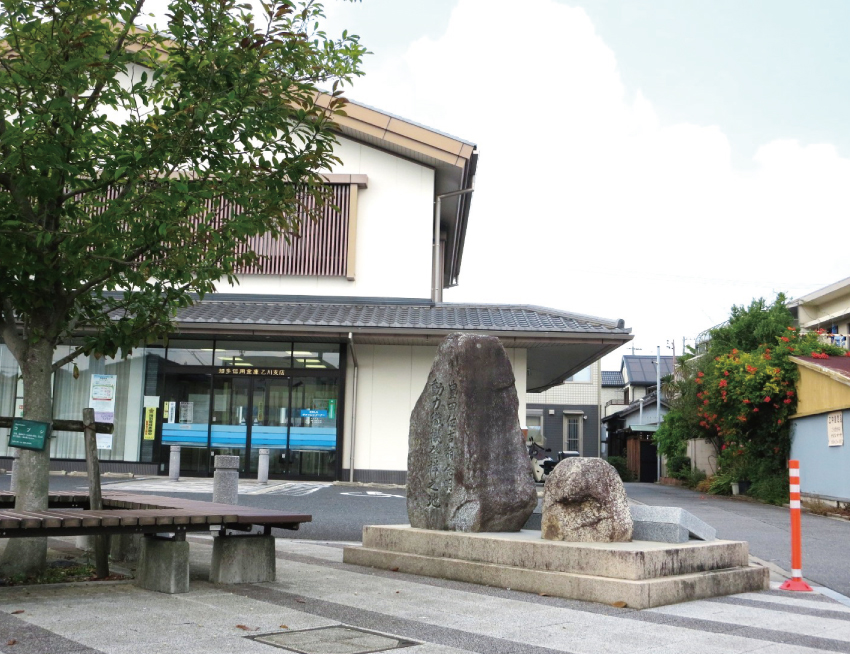 半田市乙川には、豊田佐吉が動力織機を発明した地を示す記念碑があります。乙川の庄屋 石川藤八とともに設立した乙川綿布では、豊田式汽力織機で高品質な木綿布が織られ、その名が広がりました。