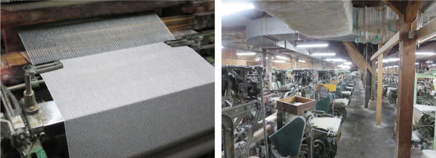 阿久比町内の工場では200台以上のシャトル織機が現役で稼働中。和装の反物幅に由来する幅35~40cmほどの小幅生地を織ります。ゆったりと糸を織り上げるため、軽くやわらかな風合いを生み出しています。