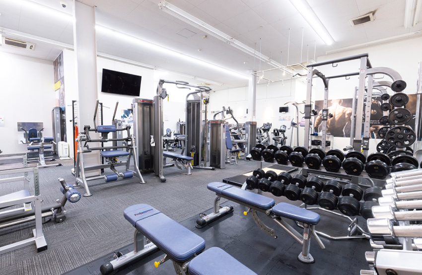 天井が高く開放感のある24時間営業ジム。ゆとりあるスペースに最新の機器がレイアウトされ、自由にトレーニングできます。