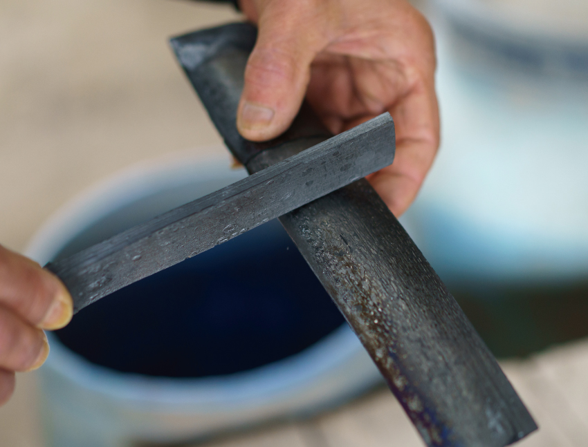 竹炭同士を合わせて叩くと、カラッと澄んだ音。竹の切り出しから乾燥、炭焼きまで、数日かけて作られます
