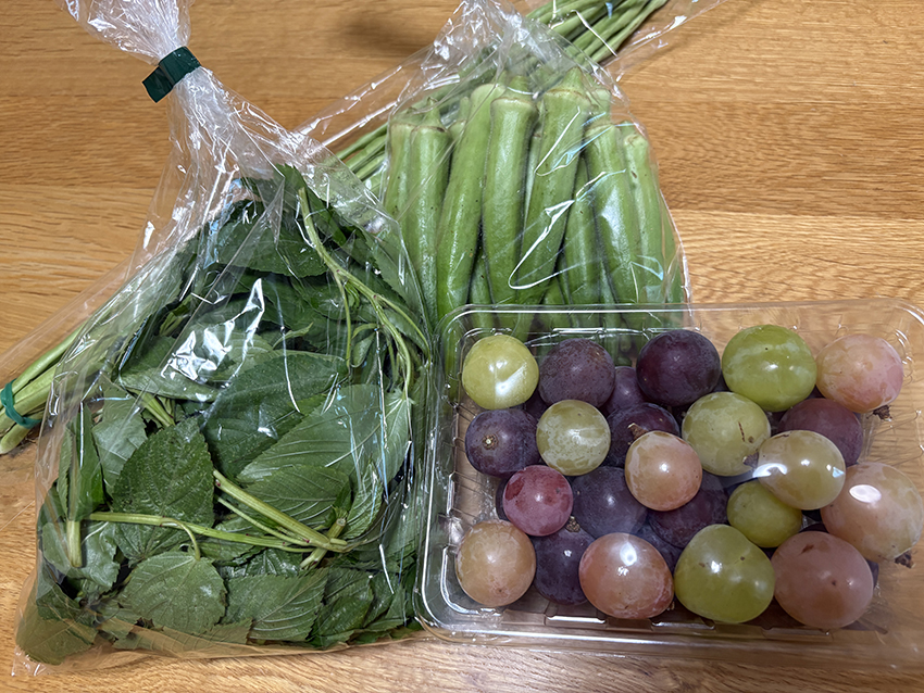 この日は大府産のブドウとオクラ、弥富産のモロヘイヤとささげを買いました。