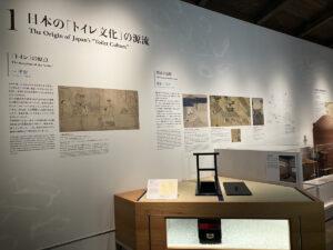 2階の展示室に入ると、明治時代の小便器のインスタレーションが目を引きます。白地に青で美しい絵付けを施した染付の便器は、「えっ、これがトイレ???」って感じるぐらい美しいの!聞けば、明治時代後期の旅館や料亭など、お客様をもてなす場所で使われた男性用小便器。映像からもトイレの清浄性や清らかさを感じます。展示室では、木製おまるから装飾的な陶磁器製便器、水洗化を経て空間としても充実した現代のトイレに至る、日本のトイレの歴史を辿る展示。特に、かつての絵図面から復元した江戸城本丸の樋箱(ひばこ)は歴史好きキッズにはたまらないね。