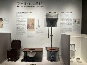展示の中でも、世界に先駆けて発明された19世紀イギリスの近代的な水洗トイレは貴重なコレクション。国産初の温水洗浄機能付き便器(シャワートイレ)など、日本のトイレ史を飾るトイレの数々が並びます。