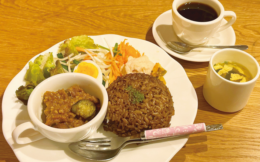 見た目にインパクトがある「ブラウンライスにキーマ添え(1,200円)」は、コーヒーで炊いたごはんが主役の珍しい一品。ほんのり香るコーヒーの風味はスパイシーなキーマとの相性も抜群。店内では、音楽ライブやトークショーなどユニークなイベントも随時開催。5月16日(金)には、東京フィルハーモニー交響楽団首席チェロ奏者・渡邉辰紀のソロコンサートを開催予定。J.S.バッハの無伴奏チェロ組曲(全6曲)を演奏し、13席限定で渡邉氏との茶話会も。申し込みは電話にて。