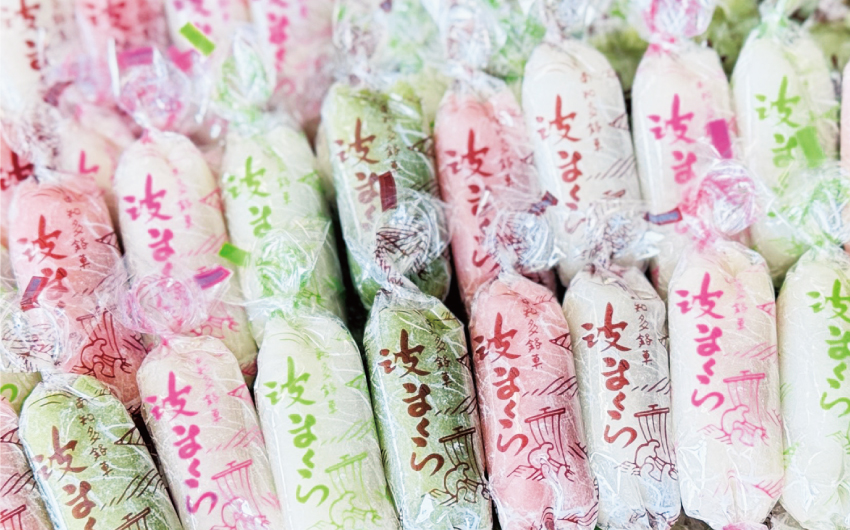 発売以来65年以上にわたり、観光土産や手土産に喜ばれる「波まくら」。しっかりと炊き上げた粒あんを、ふんわりとした生せんべいで一つひとつ丁寧に包み、一口食べたら止まらない美味しさは内海を訪れたらぜひ手に入れたい逸品です。旅のお供にぴったりな1個売りがあるのも嬉しい。本店限定で5種入りも購入できます。