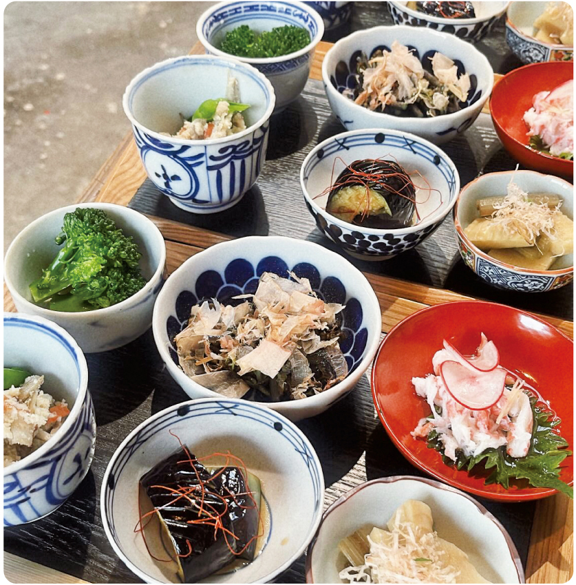 夜はカツオと昆布、鶏出汁がベースのおでんをはじめ、カウンターには知多半島の旬菜を使ったお晩菜がズラリ。茶めしにおでんの豆腐をのせた「とうめし」や、半熟玉子のおでんなどオリジナル料理も人気。あわせて楽しめる地酒も揃う。ランチタイムは定食メニューを提供中。