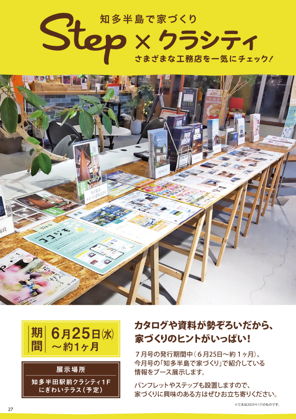 7月号の発行期間中(6月25日~7月25日)、今月号の「知多半島で家づくり」で紹介している情報をブース展示します。パンフレットやStepも設置しますので、家づくりに興味のある方はぜひお立ち寄りください。※写真は2024年1月のものです