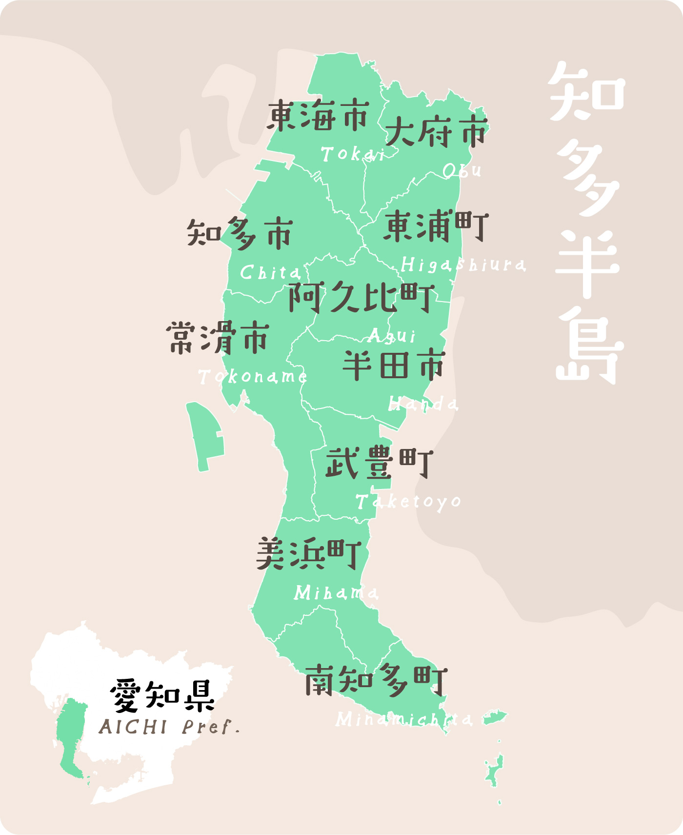 日本の中央に位置する愛知県の南に位置する伊勢湾と三河湾に囲まれた半島で、半田市、常滑市、東海市、大府市、知多市、阿久比町、東浦町、南知多町、美浜町、武豊町、の五市五町、10の市町からなります。